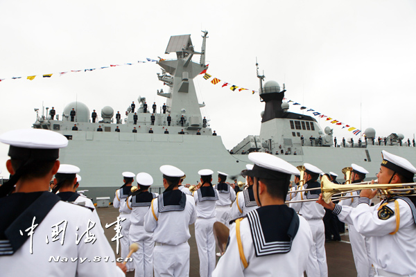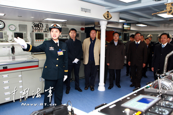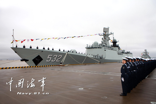 上午9时,荆州舰全体官兵在舰舷整齐站坡。荆州舰舰长王红兵介绍说,荆州舰是我国自行设计、建造的新一代导弹护卫舰,综合攻防能力强,配有多型对海、对空、反潜武备及完善的预警探测系统。荆州舰的建造与入列,将进一步提高海军部队体系作战能力,有效维护国家海洋权益。