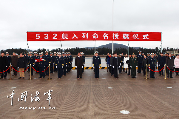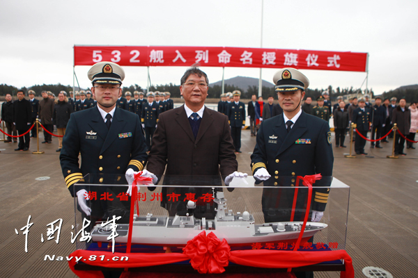 中国海军网1月5日舟山电 侯 瑞 王志鹏 温子东报道:今天上午,导弹护卫舰荆州舰入列命名授旗仪式,在东海舰队某驱逐舰支队军港举行。