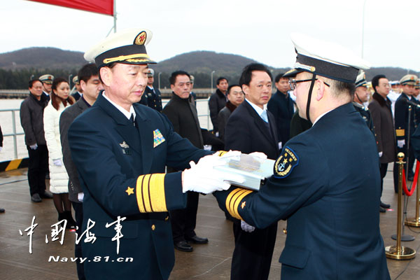 东海舰队政委王华勇向荆州舰授旗并颁发命名证书。荆州市有关领导及荆州舰所在支队领导参加了入列命名授旗仪式。