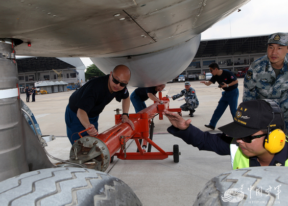 外出任务,林波(左一)总是以身作则,时时处处站排头、当表率。图为与战友一起对接飞机牵引杆。